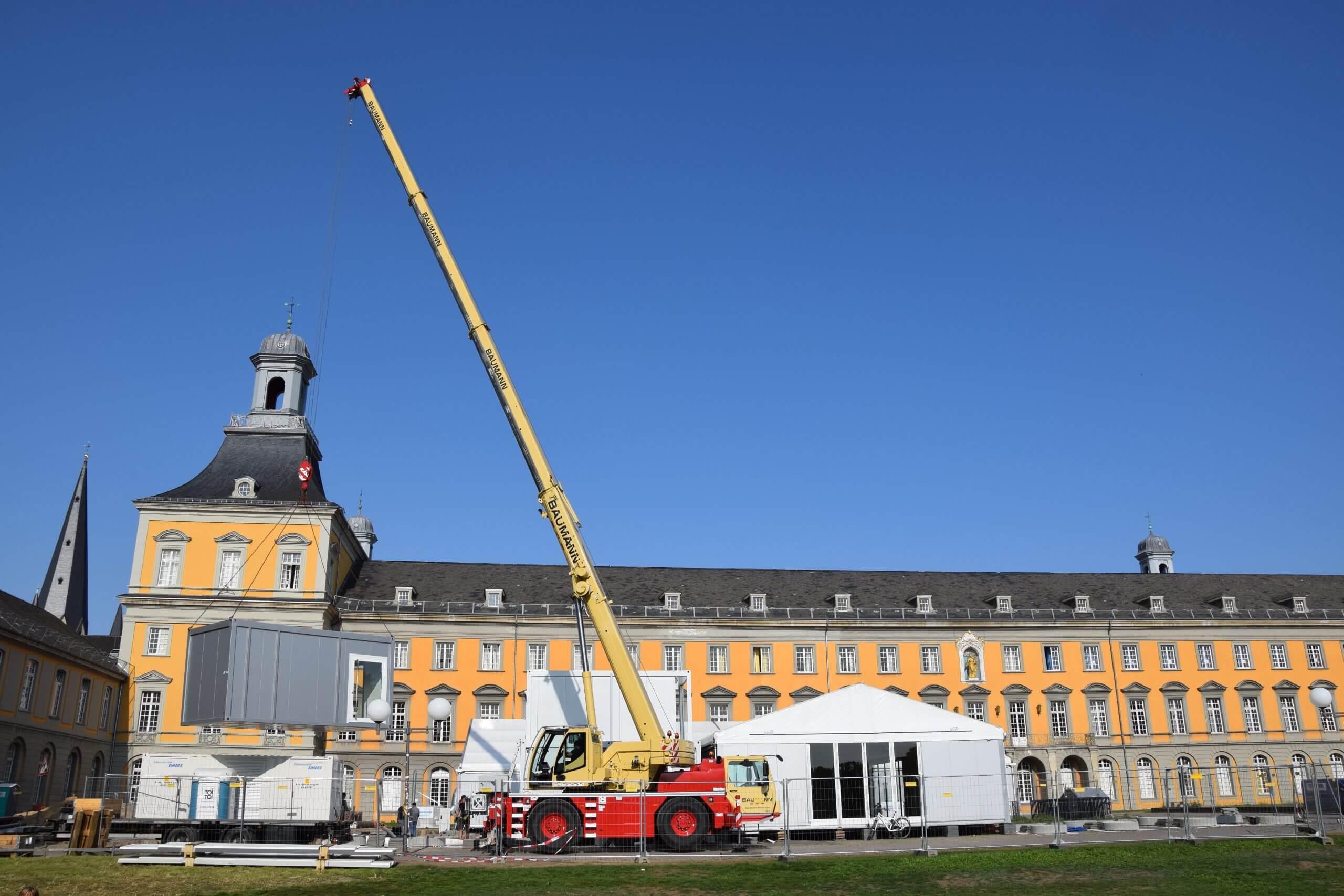 Die Interimsmensa steht auf der geschichtsträchtigen Hofgartenwiese, direkt vor dem Bonner Schloss, Sitz der Universität zu Bonn. Sie wird dort für die Dauer des Neubaus die Versorgung übernehmen, voraussichtlich für drei Jahre. Die Eröffnung ist für November geplant.